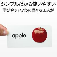 日常生活のなかでよく見る物や生き物などの名詞96の英単語を収録。表には写真(または形・色)と英単語、裏には英単語のみを記載。