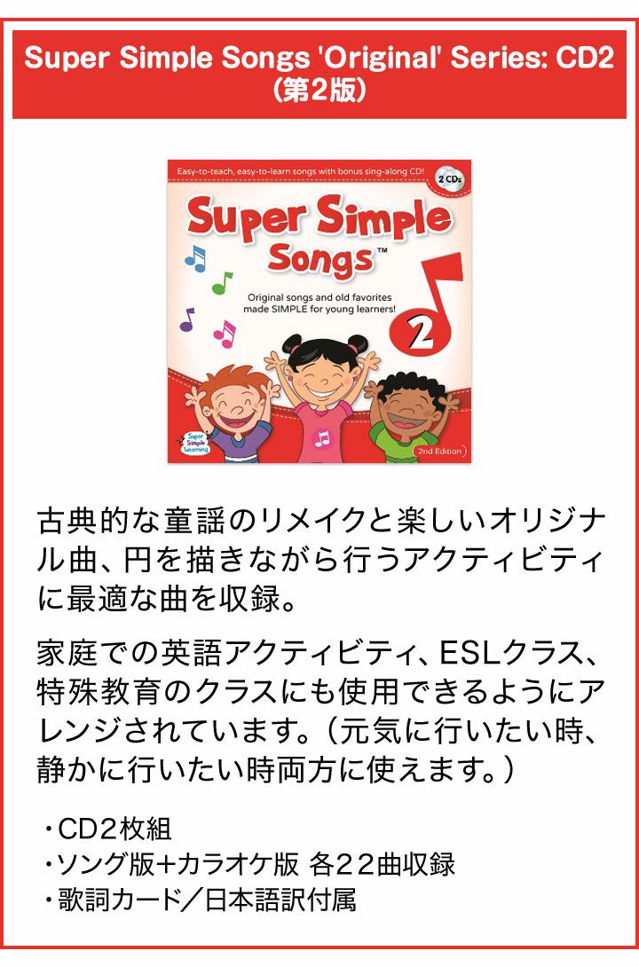 他の画像を見る 英語 幼児 CD スーパーシンプルソング 英語教材 子供英語 英会話 子ども 教材 英語教室 知育玩具 0歳 1歳 1歳半 2歳 3歳 4歳 5歳 6歳 7歳 子供 こども 男の子 女の子 英語 幼児 CD Super Simple Songs 1.2.3(第2版)CDセット 価格 ¥ 4,950 税込 お気に入りに追加