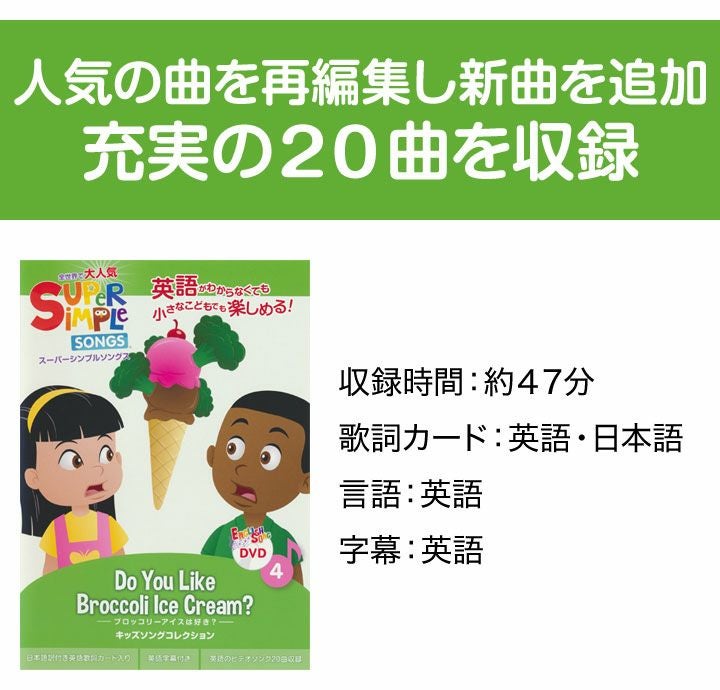 他の画像を見る 絵本のような英語ソング マザーグース フォニックス 子ども 英会話 赤ちゃん 英語教育 ナーサリーライム 英語の歌 誕生日 プレゼント 幼児英語 DVD Super Simple Songs Do you Like Broccoli Ice Cream? 価格 ¥ 2,189 税込 お気に入りに追加