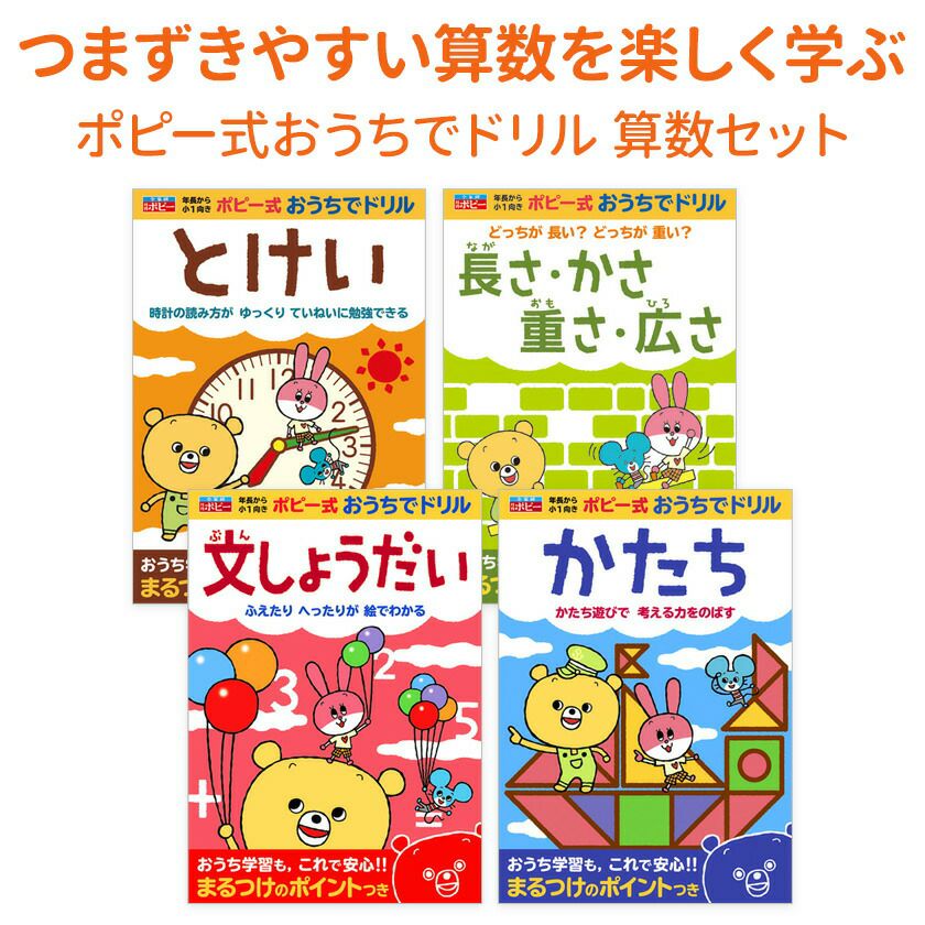 他の画像を見る 小学校の授業に慣れる おうちドリル さんすう 自宅学習 幼稚園 年長 小学1年生 とけいの読み方 長さ かたち ポピー式 おうちでドリル つまずかない 算数 4冊セット 価格 ¥ 2,640 税込 お気に入りに追加
