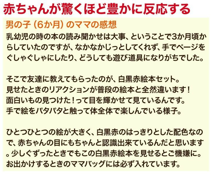 他の画像を見る 知育玩具 白黒理論 赤ちゃん おもちゃ 0歳 赤ちゃん用品 赤ちゃんグッズ 新生児 絵本 知育 あかちゃん 育脳 パパ大豆の白黒赤絵本セット 解説書付き 価格 ¥ 2,640 税込 お気に入りに追加 在庫切れ