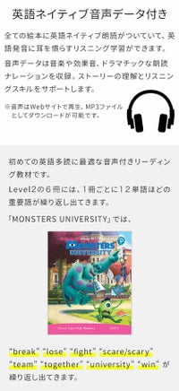 英語を学び始めた子供たちがよく触れる、使用頻度の高い単語で物語を楽しめるレベル2パックのディズニー絵本に加えて、読んだ内容を深く理解できるワークブックをセットにしました。